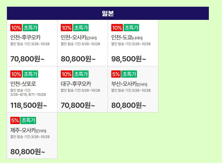 부산-오사카(간사이) ,80,800원부터 (할인탑승기간 : 3/26~10/28) 5% 할인