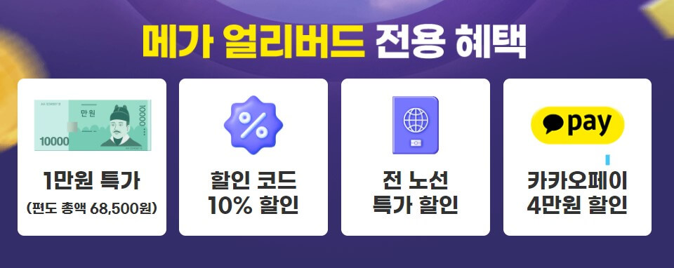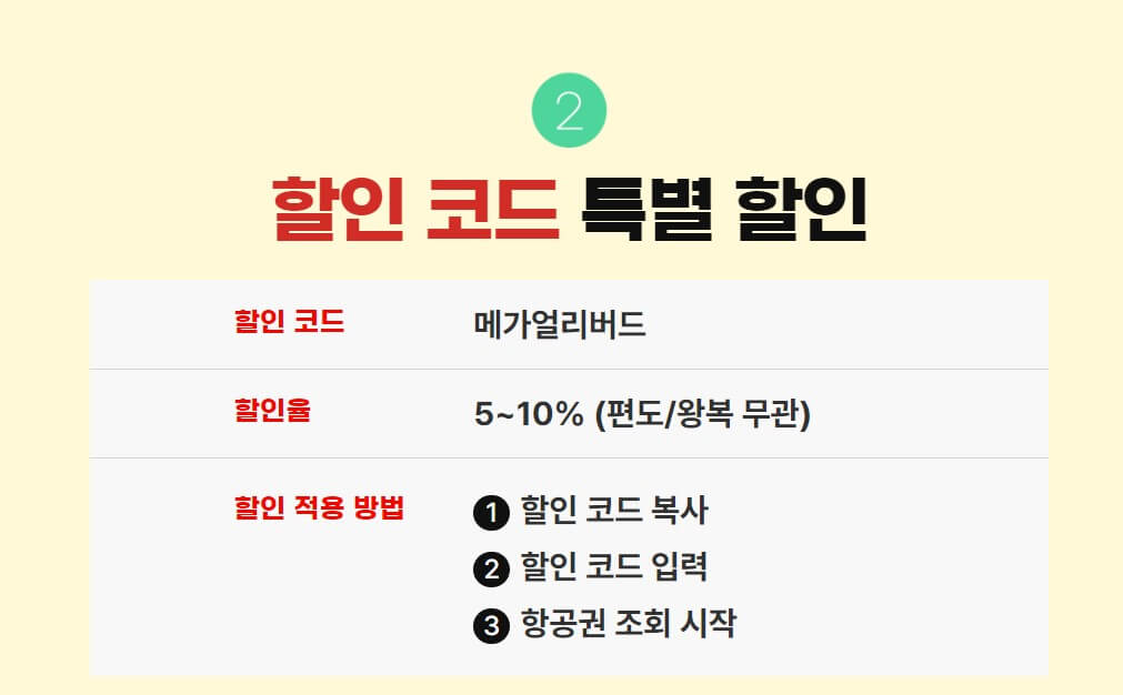 탑승일 03.26~10.28 사이의 항공권 검색창에 메가 할인코드인 메가얼리버드 입력하면 됩니다.