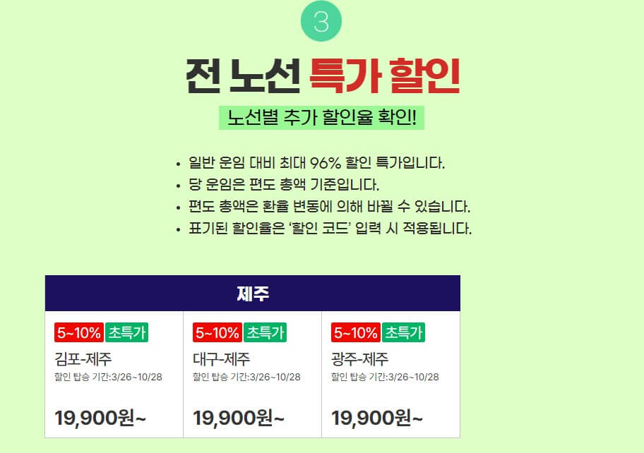 광주-제주 19,900원부터 (할인탑승기간 : 3/26~10/28) 5~10% 할인